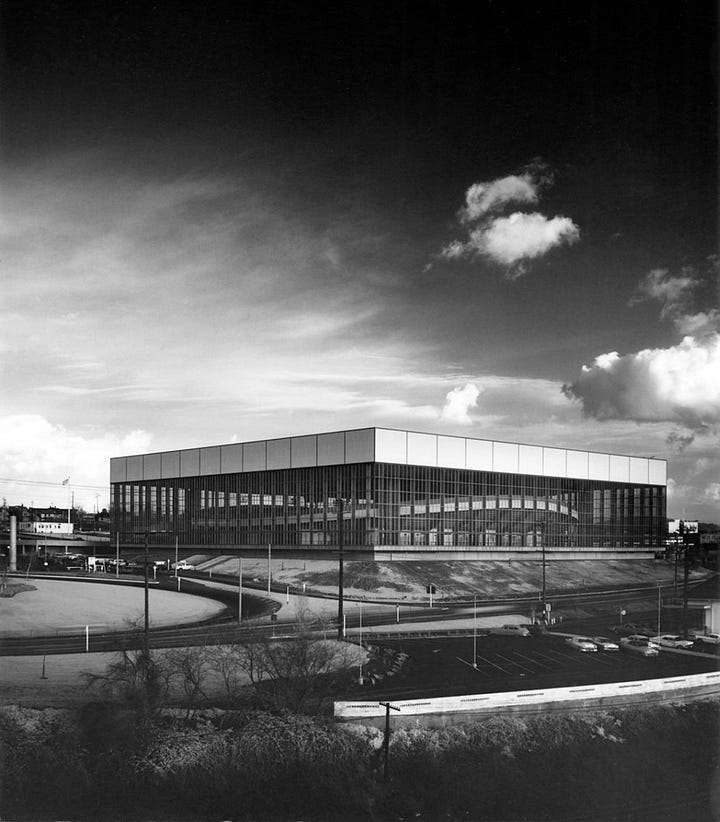Composed of gray-tinted glass, the glass walls are capped at the top of the building by a white strip of acrylic overlaid on plywood fascia. To cover the 80,000 square feet of windows, SOM designed a special blackout curtain which, at the time of its installation, was the largest continuous curtain in the United States. When it opened in 1960, the building was also the only glass-walled International Style stadium in the Pacific Northwest.