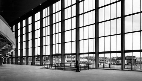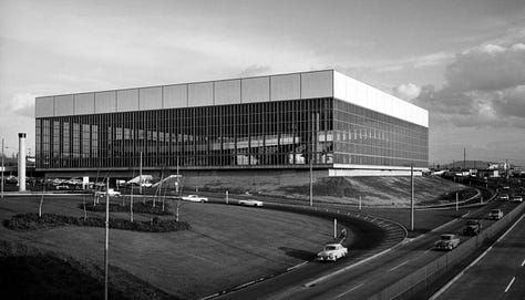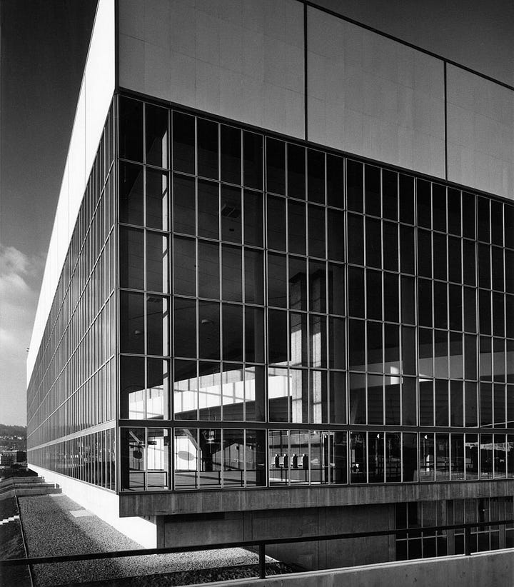 Located in Portland, Oregon, the Veterans Memorial Coliseum directly expresses SOM’s conviction that successful architecture depends on the balanced union of art and engineering. The design team, led by Myron Goldsmith, used a grid of reinforced concrete columns and cantilevered steel trusses to form a square building, 360 feet wide on each side. Unlike most arenas, SOM wrapped the building in modular 3.5-foot by 9-foot glass panels, flooding the interior with natural light.